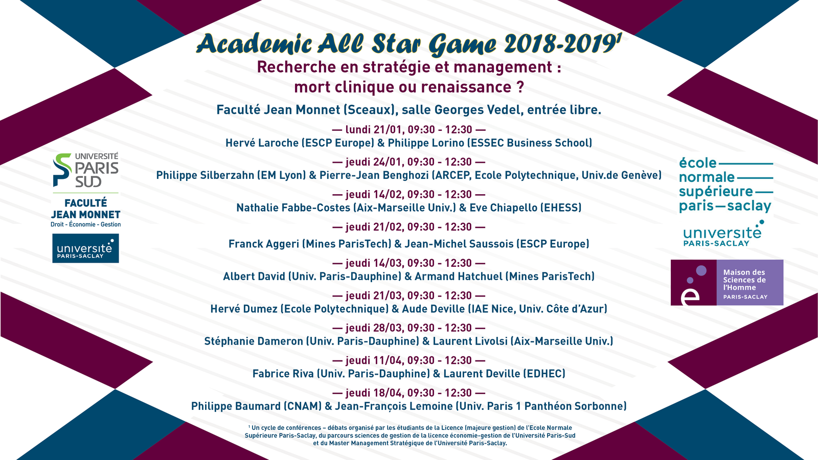 L’Academic All-Star Game est un cycle de conférences présenté par les les étudiants de l’université Paris-Saclay, en partenariat avec l’Université Paris-Sud et la faculté Jean Monnet, ainsi que le RITM, et avec le soutien de la MSH Paris-Saclay.