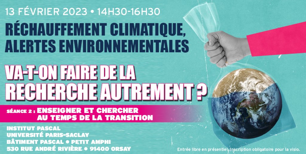 La deuxième séance du séminaire « Réchauffement climatique, alertes environnementales : va-t-on faire de la recherche autrement ? » a lieu le 13 février 2023 de 14h30 à 16h30 dans le petit amphithéâtre de l’Institut Pascal. Elle porte sur le thème :