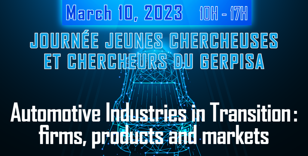Le 10 mars 2023 a lieu la journée des jeunes chercheuses et chercheurs du Gerpisa sur le thème « Automotive Industries in Transition : firms, products and markets » au Comité des Constructeurs Français d’Automobiles (CCFA) à Paris.