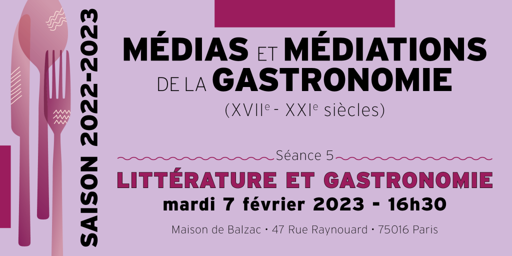 Le mardi 7 février 2023 à 16h30, la cinquième séance de la saison 2022-2023 du séminaire « Médias et médiations de la gastronomie » organisé par le CHCSC et soutenu par la MSH Paris-Saclay portera sur la « Littérature et gastronomie ». Au programme :