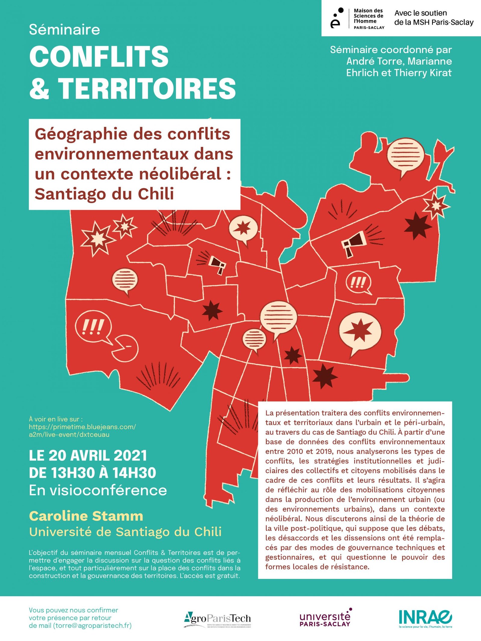 Au programme : La présentation traitera des conflits environnementaux et territoriaux dans l’urbain et le péri-urbain, au travers du cas de Santiago du Chili. A partir d’une base de données des conflits environnementaux entre 2010 et 2019, nous analyserons les types de conflits, les stratégies institutionnelles et judiciaires des collectifs et citoyens mobilisés dans le cadre de ces conflits et leurs résultats. Il s’agira de réfléchir au rôle des mobilisations citoyennes dans la production de l’environnement urbain (ou des environnements urbains), dans un contexte néolibéral. Nous discuterons ainsi de la théorie de la ville post-politique, qui suppose que les débats, les désaccords et les dissensions ont été remplacés par des modes de gouvernance techniques et gestionnaires, et qui questionne le pouvoir des formes locales de résistance.