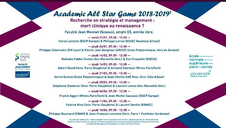 Ce séminaire, appelé à être reconduit chaque année, prend pour 2018-19, le thème : « Recherche en stratégie et management : mort clinique ou renaissance ? ».
