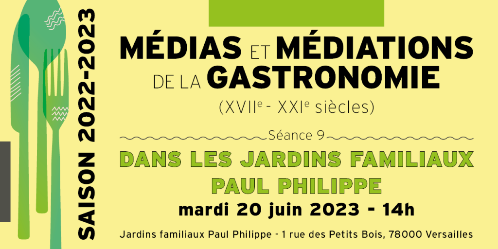 Le mardi 20 juin 2023 à 14h, la neuvième séance de la saison 2022-2023 du séminaire « Médias et médiations de la gastronomie » organisé par le CHCSC et soutenu par la MSH Paris-Saclay aura pour sujet « Dans les jardins familiaux Paul Philippe ». Au programme :