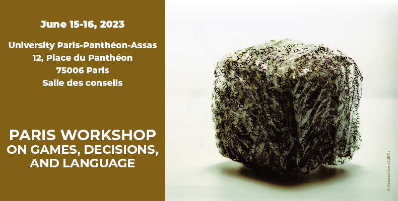 The Paris Workshop on Games, Decisions, and Language will take place at the Université Paris-Panthéon-Assas on 15 and 16 June 2023 with the financial support of: University Paris-Panthéon-Assas, Labex MME DII, and Maison des Sciences de l’Homme Paris-Saclay.