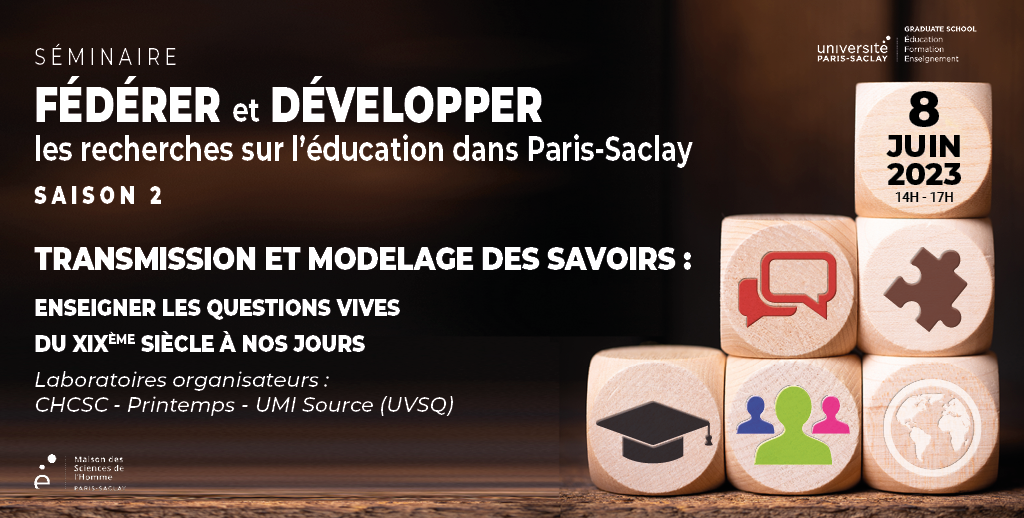 La séance 3 du séminaire « Fédérer et développer les recherches sur l’éducation dans Paris-Saclay » (Saison 2) aura lieu jeudi 8 juin 2023 de 14h à 17h à l’Université Versailles Saint-Quentin-en-Yvelines. Elle est organisée par les chercheurs du CHCSC, UMI-SOURCE et Printemps sur le thème : « Transmission et modelage des savoirs ».