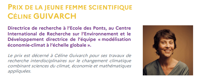 Félicitations à Céline Guivarch (CIRED) qui a reçu le 15 décembre le Prix Irène Joliot-Curie 2020 (Prix de la Jeune Femme scientifique) décerné par le ministère de l’Enseignement supérieur et de la Recherche et par l’Académie des Sciences.
