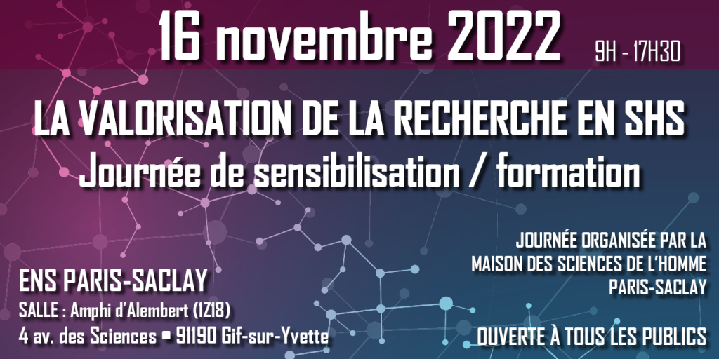 La Maison des Sciences de l’Homme (MSH) Paris-Saclay est une structure d’accueil, d’impulsion, de promotion et de diffusion de la recherche en sciences humaines et sociales. Elle organisait le 16 novembre à l’ENS Paris-Saclay une journée de sensibilisation à la valorisation de la recherche en sciences humaines et sociales. Plusieurs professionnels du domaine de l’innovation étaient présents pour expliquer les démarches et les solutions de la valorisation en SHS, ainsi que le cadre juridique et de recherche. Trois intervenants ont présenté des programmes spécifiques d’accompagnement et de financement de la valorisation. Trois autres présentations rapportaient des retours d’expériences de chercheurs qui se sont lancés dans l’aventure de valorisation.