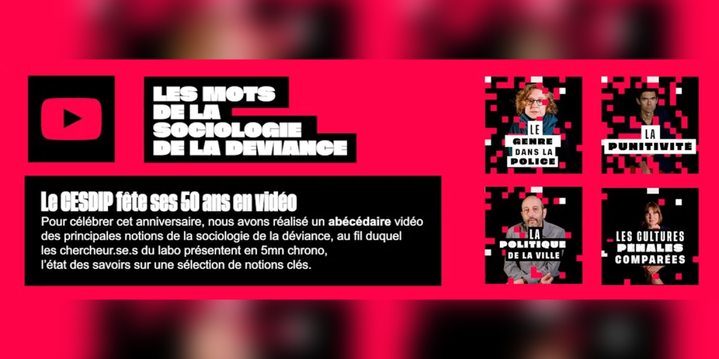 Cesdip (Centre de recherches sociologiques sur le droit et les institutions pénales) a réalisé, pour ses 50 ans, un certain nombre de capsules vidéos portant sur « les mots de la sociologie de la déviance ». Ces courtes vidéos rendent compte des recherches menées au Cesdip sur des thèmes tels que Punitivité, Coopérations police/justice, Abolitionnisme pénal, Contrôles d’identité, Politique de la ville, Réformes des polices, Délinquance en col blanc, Incivilités, Histoire du bagne colonial ou Genre et police.