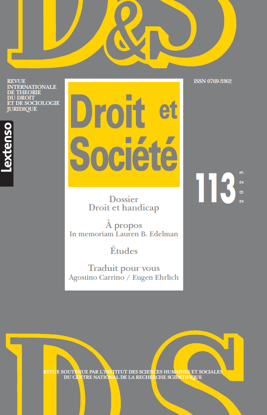 Le numéro 113 (2023/1) de Droit et Société est constitué d’un dossier thématique intitulé « Droit et handicap », d’un hommage à Lauren B. Edelman, de trois articles en rubrique Études, et d’un texte d’Agostino Carrino traduit de l’italien.