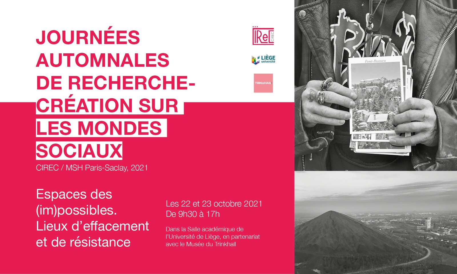 Les Journées automnales de recherche-création sur les mondes sociaux, soutenues par la MSH Paris-Saclay et le CIREC, ont eu lieu les 22 et 23 octobre 2021 de 9h30 à 17h dans la Salle académique de l’Université de Liège, sur le thème « Espaces des (im)possibles.